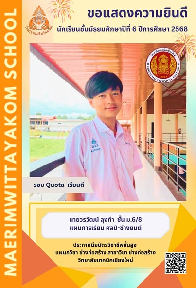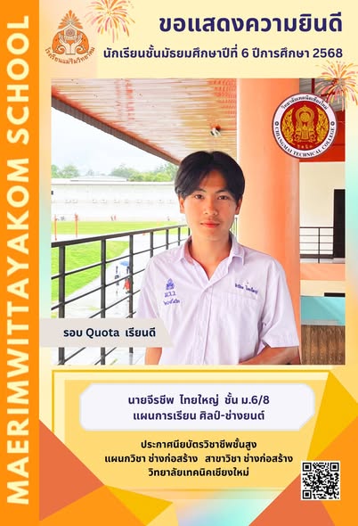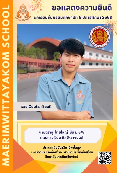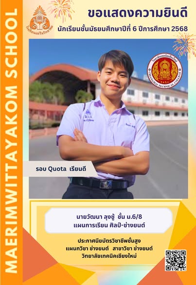 ขอแสดงความยินดีกับนักเรียนระดับชั้นมัธยมศึกษาปีที่ 6 ปีการศึกษา 2568 ที่ผ่านการคัดเลือกและมีสิทธิ์เข้าศึกษาต่อ ระดับประกาศนียบัตรวิชาชีพชั้นสูง วิทยาลัยเทคนิคเชียงใหม่ ปีการศึกษา 2569 รอบQuota เรียนดี จำนวน 20 คน ![]()