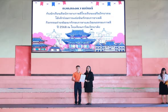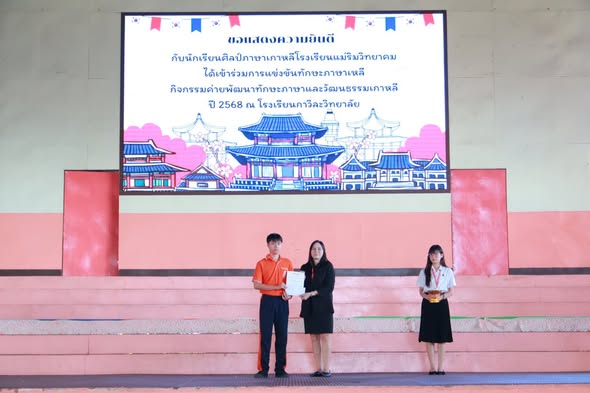On October 29, 2025, Ms. Somjit Takamsaeng, Director of Maerim Wittayakhom School, assigned Ms. Sirakan Thanajomsurang, Deputy Director, to preside over the certificate presentation ceremony to congratulate the students from the Korean Language Program (Grades 10–12) who received awards for participating in the Korean Language Skills Competition during the 2025 Korean Language and Culture Development Camp held at Kawila Wittayalai School.