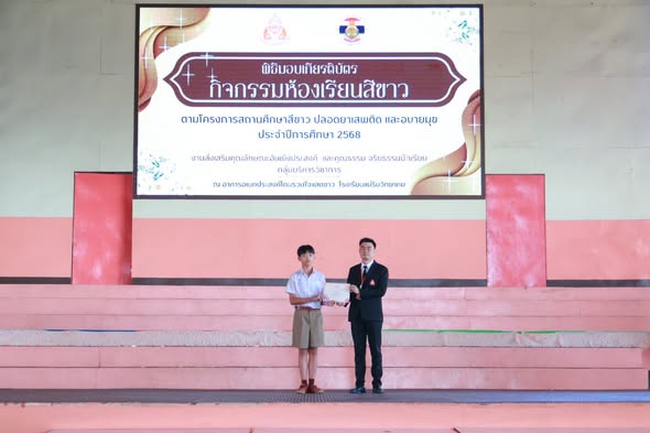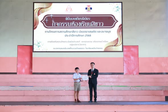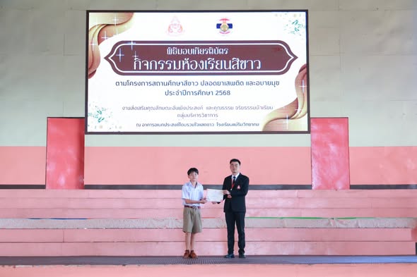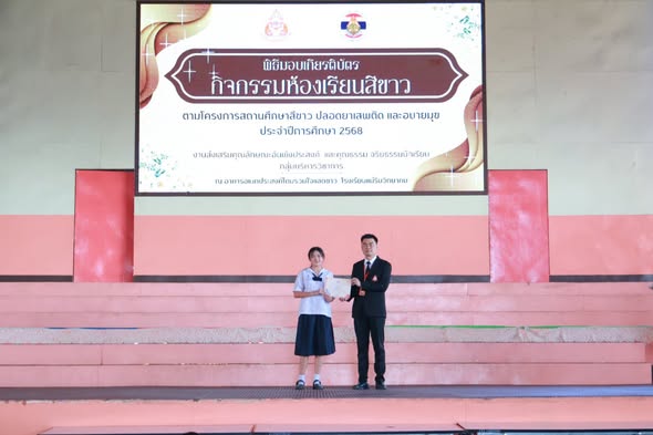 On October 29, 2025, Ms. Somjit Takamsaeng, Director of Maerim Wittayakhom School, assigned Mr. Krisana Chankhaw, Deputy Director, to preside over the certificate presentation ceremony to congratulate students from Grades 7–12 who received certificates for the “White Classroom Activity” under the White School Project — a drug- and vice-free school initiative for the academic year 2025, held at the “Ruamjai Saedkao Dome” of Maerim Wittayakhom School.