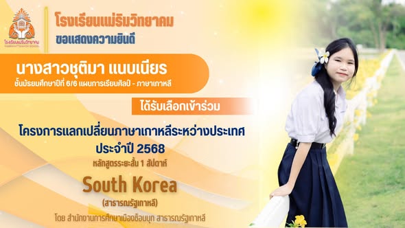 โรงเรียนแม่ริมวิทยาคม ขอแสดงความยินดีกับคุณครูกลุ่มสาระการเรียนรู้ภาษาต่างประเทศอื่น(ภาษาเกาหลี)และนักเรียนแผนการเรียนศิลป์-ภาษาเกาหลี ระดับชั้นมัธยมศึกษาตอนปลาย ได้รับคัดเลือกเข้าร่วมโครงการแลกเปลี่ยนภาษาเกาหลีระหว่างประเทศ หลักสูตรระยะสั้น 1 สัปดาห์ ณ สาธารณรัฐเกาหลี![]()