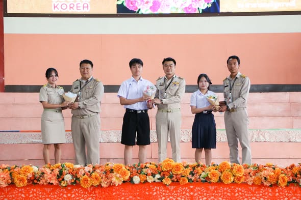 On 17 November 2025, Ms. Somjit Takamsaeng, Director of Mae Rim Witthayakhom School, assigned the Deputy Director to present bouquets to congratulate the teachers and students of Mae Rim Witthayakhom School on the occasion of their participation in the 1-week International Korean Language Exchange Program in the Republic of Korea. The ceremony was held at the “Ruam Jai Saet Khao” Dome, Mae Rim Witthayakhom School.