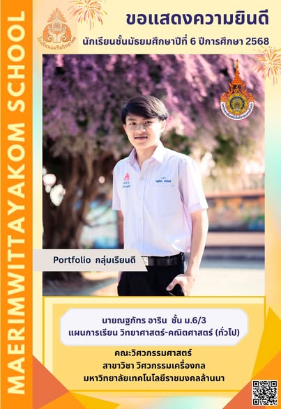 ขอแสดงความยินดีกับนักเรียนระดับชั้นมัธยมศึกษาปีที่ 6 ปีการศึกษา 2568 ที่ผ่านการคัดเลือกและมีสิทธิ์เข้าศึกษาต่อในระดับอุดมศึกษา ปีการศึกษา 2569![]()