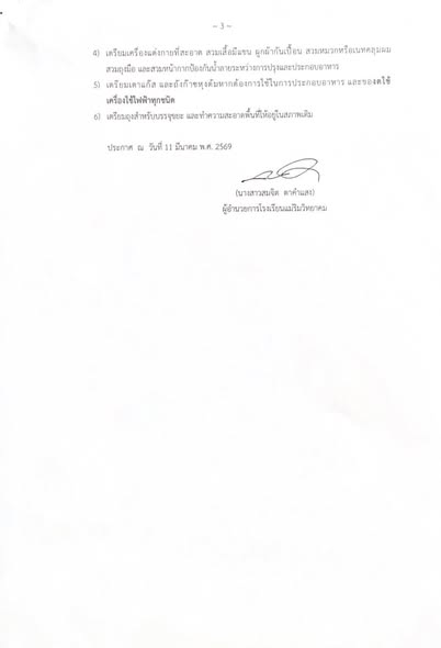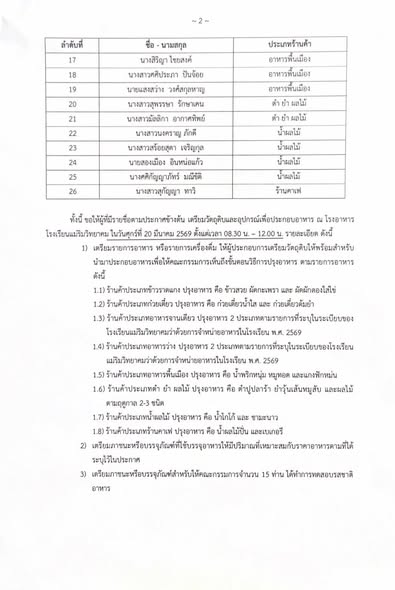ขอให้ผู้ที่มีรายชื่อ เข้ามาประกอบอาหารเพื่อรับการคัดเลือก ในวันศุกร์ที่ 20 มีนาคม พ.ศ. 2569 เวลา 08.30 น. – 12.00 น. ณ โรงอาหารโรงเรียนแม่ริมวิทยาคม ตามรายละเอียในประกาศของโรงเรียนแม่ริมวิทยาคม